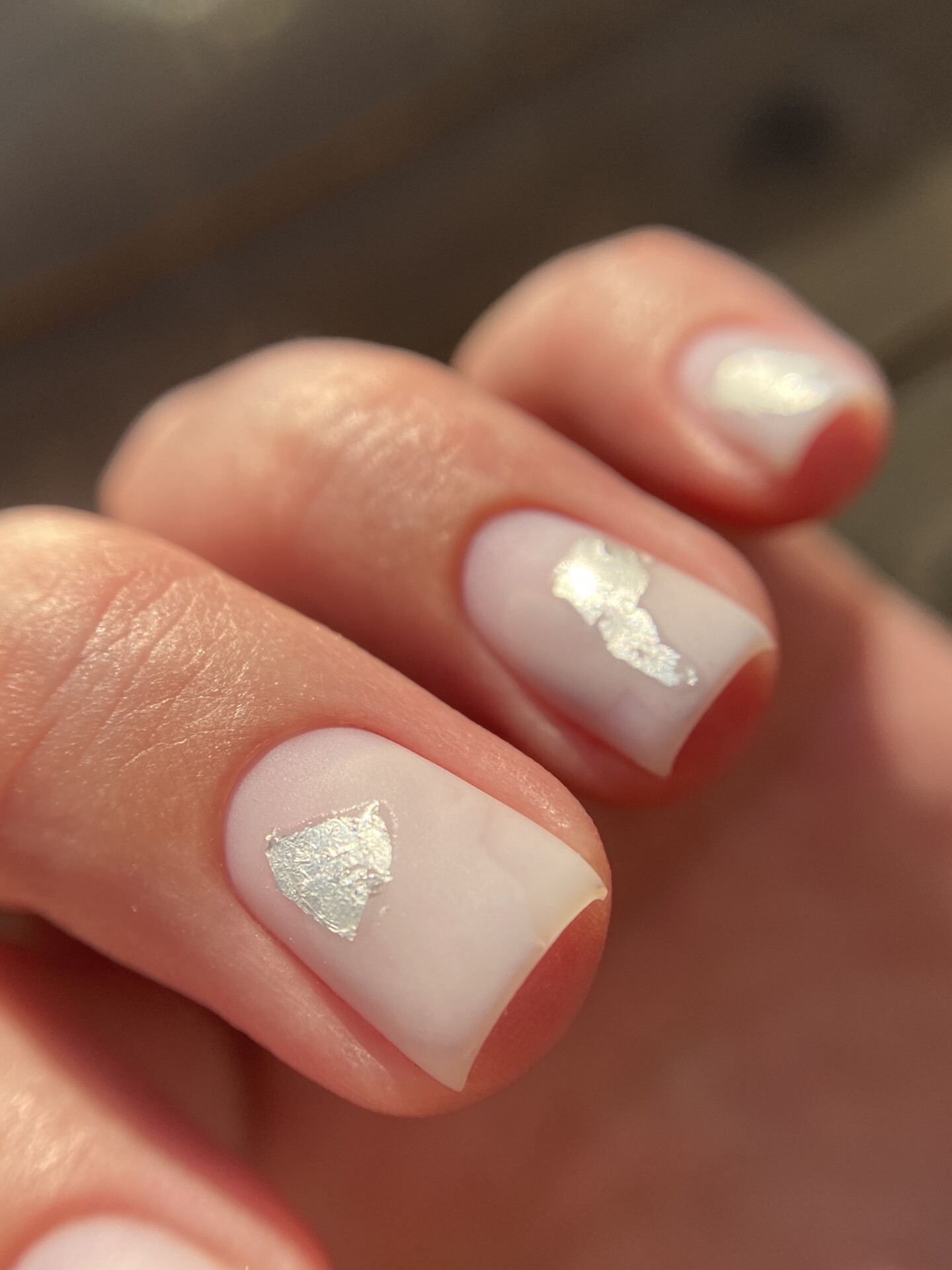 | Лёгкий дизайн Поталь, фольга, слайдер, клеящиеся ленты, паутинка, хлопья Юки, сухие блёстки, растяжка блёстками и пр., маленькая выкладка из страз, френч с блёстками | |