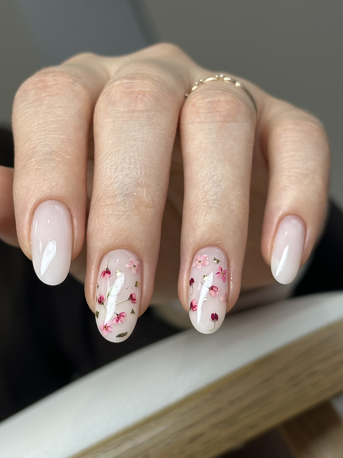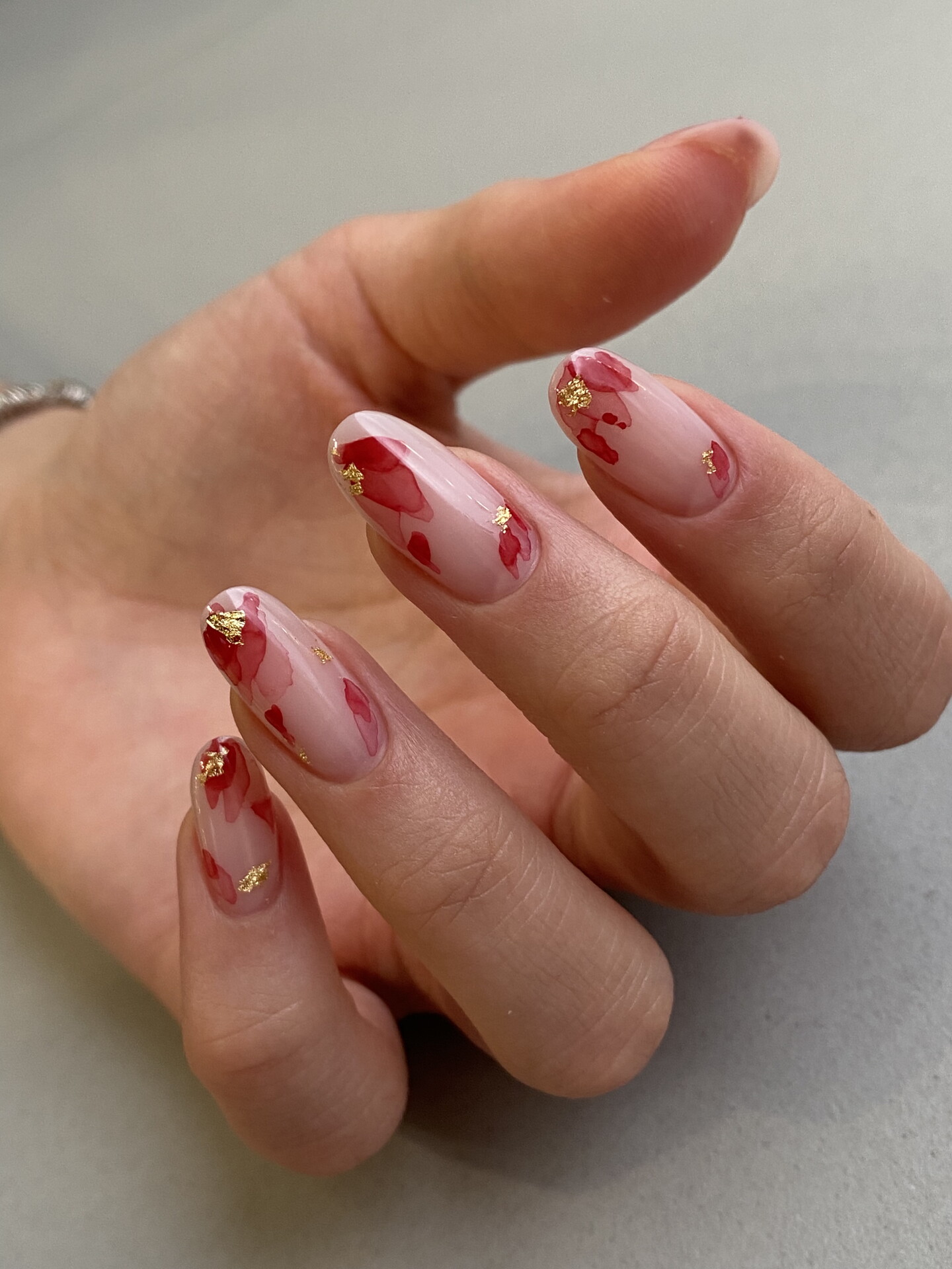 | Средней сложности Стемпинг, мрамор, битое стекло, ручная роспись, ветки, цветы | |
